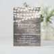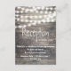 Tarjeta de recepción de boda con madera rústica y luces de cuerda. Un fondo de madera gris vintage decorado con una cadena de luces. Invitación de boda perfecta para boda con tema de luces nocturnas, tema de granero, tema de jardín, boda al aire libre con luces centelleantes.