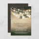 tarjeta de recepción de boda con luces de cuerda y ramas de roble antiguo. Recepción perfecta para tema de boda de campo en el jardín.