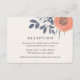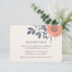 Diseñado para coincidir con nuestra colección de invitaciones de boda de Amapolas de Melocotón, nuestra tarjeta de recepción floral chic y romántica presenta un ramo de flores de amapola en melocotón coral pintadas a la acuarela, rodeadas de hojas y capullos en gris azulado suave y polvoriento y verde cazador desvaído. Agregue los detalles clave de su recepción en letra gris carbón y azul medianoche, incluyendo horario, lugar y cualquier información de valet o transporte.