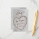 Tarjetas de recepción de boda campestres elegantes con un abedul plateado rústico con un corazón tallado que incluye los detalles de su boda y sus iniciales.