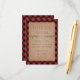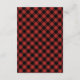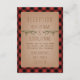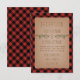 Una tarjeta de recepción de boda rústica que presenta una ilustración de ramas de árbol de hoja perenne. El fondo es de cuadro escocés rojo y negro.