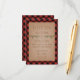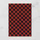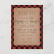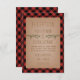 Una tarjeta rústica de recepción de boda con una ilustración de ramas de árbol de hoja perenne. El fondo es de cuadros rojos y negros.