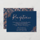 Tarjeta de recepción elegante de flores falsas de oro rosa y azul marino para una fiesta de postboda. Esta tarjeta de recepción de boda de color rosa claro y azul real se puede personalizar para incluir su mensaje y la dirección de la fiesta de recepción. La tarjeta de recepción es parte de la colección de bodas de oro rosa y azul marino. Si desea artículos personalizados adicionales, por favor contacte al diseñador.