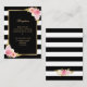Elegante tarjeta de recepción de boda floral a rayas blancas y negras con flores color agua rosadas y vegetación dorada. Elementos coincidentes disponibles.