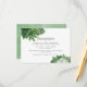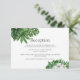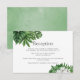 Tarjetas de recepción de boda de moda con hojas tropicales de acuarela en verde salvia y blanco y magnolias blancas.