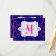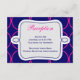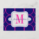 Tarjeta de recepción de boda moderna rosa fucsia y azul marino con inicial de monograma y patrón de círculo en negrita. Personalice con su información y opciones de color. Puede cambiar el color de fondo de los círculos en el patrón utilizando el menú de edición y cambiando el color del fondo. Elke Clarke©