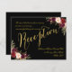 Invitación de Tarjeta de Recepción de Boda Negra y Dorada con Hojas de Borgoña en Acuarela y Hoja de Oro Falso Elegante - Diseño Horizontal. Diseño por Elke Clarke©. Otros estilos y colores disponibles en nuestra tienda www.zazzle.com/monogramgallery. Un simple guion de escritura a mano con la palabra "recepción" adorna esta tarjeta de inserción de recepción de boda clásica y moderna. El texto es totalmente personalizable. La hoja de oro es un efecto de foto impresa.