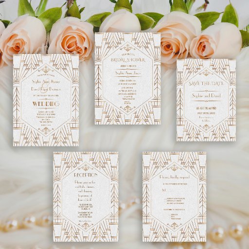 Diseño de tarjeta Boda Royal White Gold Great Gatsby. Diseño de tarjetas Royal, Romántica, Vintage con un estilo Art Deco de Great Gatsby, un Hollywood Roaring de los años 20, con un Relieve metalizado Fleur-de-lis de falso oro, divisor y fuentes magníficas. Utilice la herramienta Personalizar para agregar su información. Para más información, por favor, visita mi Colección Gatsby de los Grandes Blancos de los años 20.