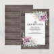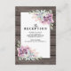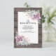Invitaciones de recepción de boda campestre chic con un fondo de granero de madera rústica, una exhibición de esquina de suculentas y una plantilla de texto de boda.