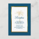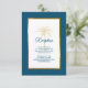 Proporcione a sus huéspedes todos los detalles de la recepción de su boda con esta tarjeta de recinto tropical con escritura moderna, texto azul océano que incluye una palmera dorada artística y marco de oro metálico en la parte delantera de la tarjeta. El fondo azul marino, que se coordina, está delante y detrás.