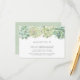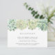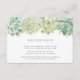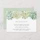 Tarjeta para la recepción de bodas botánicas con un borde superior que consiste en suculentos acuarelas verdes y sus detalles en un suave tipo de letra gris. En la parte trasera hay un lavabo de acuarela verde. Los suculentos añaden un gran elemento natural al diseño. Si la recepción se celebra en un lugar distinto al de la ceremonia, estas tarjetas de la caja son una buena manera de proporcionar información sobre la recepción, como la dirección, hora y vestimenta. Estas tarjetas son perfectas para un boda del desierto en primavera o verano.