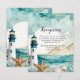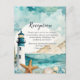 Hermosa tarjeta de recepción matrimonial con faro náutico en blanco y negro, pez estrella y conchas. Ideal para un boda. Las palabras se pueden cambiar para adaptarlas a sus propios detalles o requisitos