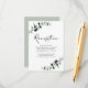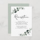 Tarjeta de información de recepción de caligrafía moderna Eucalyptus... Diseñada para coordinar con nuestras invitaciones nupciales de Eucalyptus Greenery, nuestra tarjeta del recinto de recepción informa a sus invitados de las actividades que tienen lugar después de la ceremonia del boda. Nuestra tarjeta de recepción botánica está decorada con hojas de eucalipto de color esmeralda que rodean la recepción y que se encuentran en un blanco inmaculado. La parte trasera de la tarjeta está en verde sabio. La caligrafía moderna de moda muestra el texto de "Recepción". El resto del texto puede revisarse fácilmente en la plantilla de personalización.