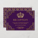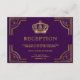 Elegante tarjeta de recepción con un elegante borde dorado ornamentado y hermosa corona en un fondo morado oscuro.