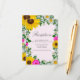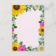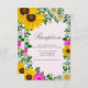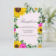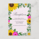 Invitación a una boda rústica con girasoles vibrantes, daises blancos tradicionales y flores rosadas sobre un fondo rosa claro con el aliento del bebé y acentos botánicos de vegetación
