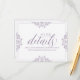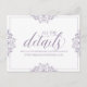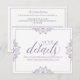 Los elegantes detalles de la boda insertan las coordenadas de la tarjeta perfectamente con nuestra suite de invitaciones de Nadine. El color de diseño está definido en lavanda (púrpura claro), pero puede cambiar el color del diseño cambiando el color de fondo. **CÓMO CAMBIAR EL COLOR DE DISEÑO** 1) Haga clic en el botón "Personalizar". 2) Haga clic en el enlace "ClICK TO PERSONALIZAR FURTHER" en la parte inferior. Entonces tendrá la opción de cambiar su "COLOR DE FONDO" a su color boda. No olvides cambiar el color del texto para que coincida con tu diseño.