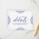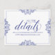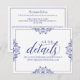 Los elegantes detalles de la boda insertan las coordenadas de la tarjeta perfectamente con nuestra suite de invitaciones de Nadine. El color de diseño está establecido en azul real, pero puede cambiar el color del diseño cambiando el color de fondo. **CÓMO CAMBIAR EL COLOR DE DISEÑO** 1) Haga clic en el botón "Personalizar". 2) Haga clic en el enlace "ClICK TO PERSONALIZAR FURTHER" en la parte inferior. Entonces tendrá la opción de cambiar su "COLOR DE FONDO" a su color boda. No olvides cambiar el color del texto para que coincida con tu diseño.
