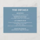 Ambas caras de esta tarjeta de gabinete de detalles de código QR del Boda Azul Dusty son fáciles de personalizar usando la plantilla de personalización en línea antes de realizar el pedido, para incluir detalles que sus huéspedes pueden encontrar útiles. Al escribir el texto pertinente en la plantilla en línea, cambie la dirección URL (dirección del sitio web) del código QR, que se actualizará automáticamente en el diseño. Personalice también la redacción para mostrar detalles útiles para sus huéspedes, como la hora de la recepción y las notas sobre la recepción, los detalles de las habitaciones sugeridas, una fecha de respuesta para mostrar en la parte posterior de la tarjeta y también la dirección web de su boda para las personas que prefieran escribir la dirección web en un ordenador manualmente para visitar su sitio web boda. Una vez que haya personalizado los detalles, si desea ajustar el diseño, puede personalizar el diseño más adelante a través del botón "Editar usando la herramienta de diseño", que está disponible desplazando hacia abajo en la plantilla de personalización.