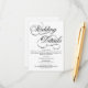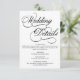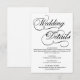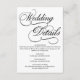 Una tarjeta de detalles de boda blanco formal y elegante con guión de caligrafía negra.