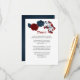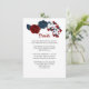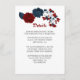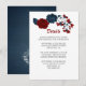 Elegante tarjeta de detalles botánicos de flores rojas y navales.