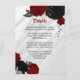 Flores elegantes rojas y negras con hojas grises sobre la tarjeta de detalles botánicos de mármol gris plateado.