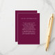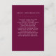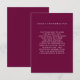 Esta tarjeta de inserción de información de invitados intemporal presenta un profundo matiz de borgoña/morado. Puedes usar estas tarjetas para incluir información sobre la recepción de tu boda, direcciones de viaje, alojamiento y todo lo que necesites que tus invitados sepan. Este diseño forma parte de la suite Boda botánico Borgoña Boho de los diseños de papel impreso.