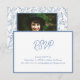 Estas elegantes invitaciones de tarjeta para el recinto de Bate Floral Azul Mitzvah RSVP incluyen la opción de personalizar total de todos los títulos y textos. La parte frontal incluye texto azul y la parte posterior presenta un diseño floral francés en toile azul oscuro junto con la foto de tu Bat Mitzvah. Introduzca la Herramienta de diseño de Zazzle para personalizaciones de diseño adicionales.