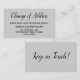 Mantén a tus amigos y familiares al día con tu nueva dirección usando estas sencillas y elegantes tarjetas de alojamiento. Las notas versátiles dicen "Cambio de dirección" en la parte delantera y "¡Mantente en contacto!" en la parte posterior, usando un tipo de letra de escritura moderno, informal y manuscrita. Utilice los campos de plantilla para agregar todos sus detalles para personalizar este diseño para su propio uso. Puede cambiar el fondo a cualquier color que desee. De la misma manera, se pueden cambiar las fuentes si se desea editar el diseño un poco más.