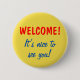 Características del este diseño del botón que los mensajes "ACOGEN CON SATISFACCIÓN!" y "es agradable verle!". Podría quizás ser utilizado por el anfitrión de un fiesta o de un cierto otro acontecimiento mientras que saludaba a las huéspedes.