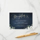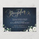 Recepción moderna de caligrafía en oro falso y flores de acuarela blancas y eucalipto verde sobre fondo azul marino oscuro, elegante y con estilo, ideal para boda rústica con vegetación, boda en jardín botánico, boda floral boho en verano e invierno.