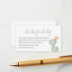 Bonita tarjeta de alojamiento Books For Baby con temática desértica. Hágale saber a los clientes que están solicitando un libro en lugar de una tarjeta. Cuenta con un delicado ilustracion de cactus acuático en tonos verdes suaves. Coincide perfectamente con la invitación de Baby Shower de Oh Boy Cactus en esta colección. Perfecto para un boho o una moderna ducha de bebé al suroeste. Seleccione el botón "Personalizar" para añadir su propia redacción.