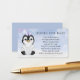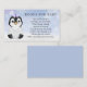 Una tarjeta de inserción para la ducha para bebés solicitada por un libro. Con un pingüino acuarela con poema: "UNA PEQUEÑA PEQUEÑA PETICIÓN, ESPERAMOS QUE NO SEA DIFÍCIL POR FAVOR LLEVAR UN LIBRO EN LUGAR DE UNA TARJETA QUE ELLOS PRESIONARÁN EL LIBRO, BIEN QUERIDOS O NUEVOS POR FAVOR, ¡RÓTULO EL INTERIOR CON UN MENSAJE!"