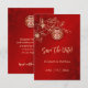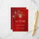 Este boda tradicional chino salva la tarjeta de fecha con una rama de arte de la línea de magnolia de oro y un símbolo de felicidad doble de oro sobre un fondo rojo brillante. Con un título "guardar la fecha" en un guión manuscrito elegante y un texto personalizado en un tipo de letra sans serif moderno.