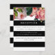 PALETA DE COLORES: negro y blanco con rosas verdes, coral y rosa. COLECCIÓN DE DISEÑO: Invitación de recepción coincidente para bodas con un lugar separado para la ceremonia y recepción o eventos comerciales formales. Con un tema de diseño chic y trendy de franjas anchas, esta invitación lleva el retro vintage a un estilo contemporáneo de tendencia. Cada capa de texto se alterna con el negro y blanco para un efecto simple pero impresionante. Cada elemento de rosa antigua fue cuidadosamente recortado y coloreado para un diseño hermoso, bonito y femenino. Gráfico audaz, pero elegante y de moda. Tenemos un conjunto de productos completo para coordinar.