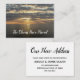 Sobre una foto original de una escena de playa con un espectacular amanecer, he colocado un texto de relleno blanco, "Los Olivers se han mudado". Hay una máscara negra sutil y opaca entre la foto y las palabras para hacer que el texto blanco aparezca más brillantemente. Eso se puede eliminar si lo prefiere. Este tipo se representó en un tipo de letra de guión moderno en negrita y bonito. Ideal para los que acaban de ir a la playa. Siéntete libre de reemplazar mi foto por la tuya, si quieres. Puede que elija cambiar sólo su nombre o el mensaje completo. ¡Use el práctico campo de plantilla para hacerlo! En la parte posterior, se utilizó el mismo tipo de letra para escribir "Nuestra nueva dirección" en negro. Debajo de esto, se proporcionan campos de plantilla para una variedad de detalles nuevos. Cambie la redacción según lo considere oportuno. También puede cambiar colores de texto, ubicación e incluso tipos de letra. // Diseñado por Melody Watson para la Muserie de Papel.