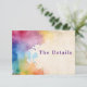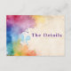 Haga que la asistencia a su boda sea fácil y alegre con esta tarjeta de gabinete "The Details", que incluye pinturas de color claro para un toque moderno y artístico. Diseñada para una gestión sencilla de RSVP, esta tarjeta combina el elegante diseño de la boda con un estilo lúdico y acogedor que ayuda a los huéspedes a confirmar rápidamente su asistencia. El vibrante arte acuarela aporta una sensación de celebración y diversión, mientras que todos los detalles de tu evento se muestran claramente por conveniencia. Perfecto para parejas que buscan una solución que ahorre tiempo y que sea a la vez elegante y animada, este inserto asegura que su proceso RSVP sea suave, memorable y lleno de personalidad.