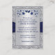 Esta elegante y romántica tarjeta de recepción floral azul marino y gris plateado tiene una cinta IMPRESIONADA y un par de joyas de diamante IMPRESIONADAS y un purpurina simulado FAUX se unió a los corazones brooch con un borde de Relieve metalizado gris plateado FAUX que coincide con la invitación a la boda que se muestra a continuación. También se puede personalizar que sea una tarjeta de direcciones, una tarjeta de alojamiento, una tarjeta de registro de regalos, una tarjeta del sitio web del boda, una tarjeta de pozo o caridad de deseos, o una tarjeta de información general cambiando el texto en consecuencia. Si necesita una tarjeta más grande, o si hay otros elementos coincidentes que necesite, envíe su solicitud a niteowlstudio@gmail.com.
