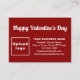 ¡Feliz Día de San Valentín! Una festividad encantadora para celebrar este mes de febrero y para anunciar también su negocio o promocionar su marca. Tarjeta de inscripción que puede personalizar poner su marca de negocios y con el saludo de San Valentín. Personalizar y úsalo para saludar a sus clientes este Día de San Valentín y como material de marketing para promocionar su negocio o promocionar su marca. También puede utilizarlo como accesorio del material de embalaje de su producto. Tarjeta de gabinete de personalizable que se puede utilizar para crear conciencia de nombres de marca. Los colores de diseño son textos blancos sobre fondo rojo. Para personalizar de esta tarjeta de gabinete, suba el logotipo de tu empresa, escribe tu nombre de negocio, dirección, número de teléfono, correo electrónico y sitio web o tu página de red social de tu empresa. Por favor, compruebe la apariencia en los lados delantero y trasero después de cargar el logotipo y escribir textos. Si la apariencia le resulta agradable, puede realizar su pedido ahora. Si necesita cambiar el tamaño y mover el logotipo y los textos para que encajen en esta tarjeta de gabinete o en el tamaño que elija, cambie la herramienta de diseño. También puede cambiar el color de fondo, el color de fuente y el estilo de fuente en la herramienta de diseño. ¡Feliz Día de San Valentín! Te deseo más ventas esta fiesta.