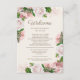 Hermosa bienvenida de boda florido rosa rosa de color rosa claro y tarjeta de itinerario que se entregará a los huéspedes cuando lleguen al boda. Esto puede funcionar especialmente bien para la boda de destino donde los invitados pasarán el fin de semana y necesitarán alguna forma de comunicación para hacerles saber todo lo que está programado. Personalice agregando su propio texto al frente y al reverso.