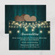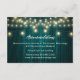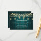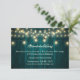 Puede poner estas tarjetas verde azuladas en sus invitaciones nupciales para informar a los huéspedes de cualquier acuerdo de hotel o código de grupo. Elementos coincidentes disponibles. Rústica carta de gabinete boda verde azulada de campo con luces de cuerda contra un verde azulado fondo de madera de granero.