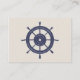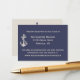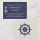 Tarjeta de información de recepción con temas náuticos del boda sobre el recinto, realizada en azul y marfil, con obras de arte antiguas del ancla del buque, en la parte delantera y en la parte posterior del volante del buque. Texto de marfil, en el frente, está listo para personalizar para su boda. Se ofrecen productos de boda de temática náutica.