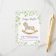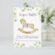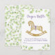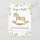 Tarjeta de Gabinete Diaper Raffle para la ducha de bebé, con un hermoso ilustracion acuático de un adorable caballo mecedor rodeado de delicadas ramas con hojas verde claro.