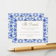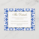 Inspirado en patrones italianos tradicionales, este diseño blanco y azul fue originalmente dibujado a mano y por lo tanto es exclusivo de nuestra tienda. Esto te permite marcar tu boda de manera efectiva y con estilo, inspirándote en la estética tradicional mediterránea. Ya sea que tu boda sea en Italia, Grecia, lugares cercanos o simplemente quieras infundir esta esencia en tu celebración, nuestras Tarjetas de Enclosure al estilo siciliano, Italian Blue, están diseñadas para eso. Son totalmente personalizables, lo que te permite adaptarlas a tus deseos. Para empezar, simplemente haz clic en 'Personalizar esta plantilla'. Si estás buscando decoración de boda que coincida con este tema, explora nuestra colección completa - una forma fácil y divertida de preparar todos los detalles encantadores para tu día especial. Si incluyes un código QR en tu sitio web de boda, no lo hagas demasiado pequeño y asegúrate de que sea de buena calidad. No dudes en hacernos saber si tienes alguna solicitud o consulta.