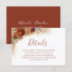 Completa tu suite de invitaciones con una sofisticación cálida y terrosa utilizando la Tarjeta de Detalles de Boda Boho de Caligrafía de Terracota Elegante. Diseñada para celebraciones modernas boho y rústico-elegantes, esta tarjeta de detalles incluye tonos ricos de terracota combinados con tipografía de caligrafía elegante. La paleta de colores cálida y soleada evoca romance desértico y elegancia natural, haciéndola perfecta para bodas al aire libre, lugares de viñedos, ceremonias en jardines y celebraciones inspiradas en el suroeste. Esta tarjeta de detalles de boda es ideal para compartir información importante como: • Sitio web de la boda • Instrucciones de RSVP • Detalles de alojamiento • Código de vestimenta • Información de transporte • Calendario de eventos del fin de semana. El diseño limpio mantiene todo organizado y fácil de leer mientras mantiene una estética suave y romántica. Se coordina perfectamente con suites de invitaciones de boda bohemias, de terracota, naranja quemada y neutras para una presentación cohesiva y pulida. Totalmente personalizable con tu texto personalizado, esta tarjeta insertable agrega funcionalidad y estilo refinado a tu papeler