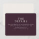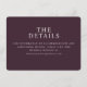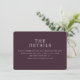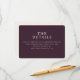 Esta tarjeta de acompañamiento para bodas presenta un diseño sofisticado y minimalista con un fondo granate profundo que emana elegancia y refinamiento. La disposición es centrada y equilibrada, utilizando una tipografía limpia en una fuente clásica serif para transmitir información esencial de manera clara. El ambiente es profesional y moderno, lo que la hace perfecta para dirigir a los invitados a detalles adicionales sobre el evento. Su estética simple pero elegante garantiza que complementa cualquier tema de boda sin problemas.