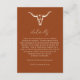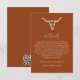 Tarjeta de detalles de boda rústica simple con cráneo de vaca - Una tarjeta de detalles de boda simple y occidental que presenta un cráneo de vaca rústico en crema de postre sobre un fondo de óxido/terracota. Esta tarjeta de detalles hace que sea fácil explicar todos los detalles a sus invitados de boda. Un código QR está en la parte posterior de la tarjeta para la url de su sitio web de boda.