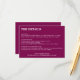 Tarjeta de detalles del Boda de código QR de vino de cereza, por favor, personalice el uso de la plantilla de personalización en línea antes de realizar el pedido. Por favor, cambie la URL que aparece en la plantilla para mostrar la dirección URL de su propio sitio web boda (para el código QR en la parte posterior) y, a continuación, personalice el listado en la parte delantera (Recepción, Alojamiento, Transporte u otros detalles útiles para sus invitados) y la fecha de respuesta en la nota al pie de la parte delantera. La parte posterior de la tarjeta es un color de vino de mora lisa, aparte del código QR, sin embargo, si necesita añadir algo extra al dorso del diseño o realizar otros ajustes, puede pulsar en el botón "Editar usando la herramienta de diseño" para "personalizar más adelante"; este botón está disponible desplazándose hacia abajo en la plantilla de personalización en línea. La parte frontal de la tarjeta del recinto contiene un texto blanco elegante, mientras que la parte posterior de la tarjeta incluye un código QR en blanco y negro (de modo que es fácil que el código QR sea escaneado por un cliente con un teléfono moderno).
