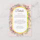 Bonita tarjeta de detalles de Boda floral Garden con un fondo suave de color rosa con elegantes acentos florales bordeados de amarillo. Perfecto para compartir con sus huéspedes información importante de los bodas, como recepción, alojamiento y detalles adicionales. Personalizar fácilmente para coincidir con el tema de su boda. Vea la colección coincidente en La_Promesse.