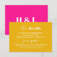 Esta es una tarjeta de detalles bodas, audaz y moderna, con un hermoso tipo de letra caligráfica y un fondo rosado caliente. Todos los colores son editables. // Para encontrar diseños coincidentes, busque "FALLON" en la tienda Sinceramente de Nicole Zazzle. * Si te gusta este diseño pero no lo ves disponible para algo que estás buscando, por favor contacta conmigo en cualquier momento :)