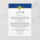 Fije el tono de su boda mediterráneo con esta elegante y personalizada tarjeta de Boda italiana con detalles de limón azul marino y Amalfi para un toque fresco y sofisticado. Una combinación de letra de guión moderno y caligráfico en azul marino destaca bellamente en un fondo blanco nítido, creando un diseño atemporal y refinado. Esta tarjeta del recinto proporciona información esencial para los bodas, incluyendo detalles de recepción, alojamiento en hotel, transporte, sitio web de los bodas y código de vestimenta, asegurando que sus huéspedes tengan todo lo que necesitan para su celebración especial. Perfecto para una costa amalfitana, toscana o boda de inspiración italiana, esta tarjeta añade un elemento elegante y coordinado a su suite boda.